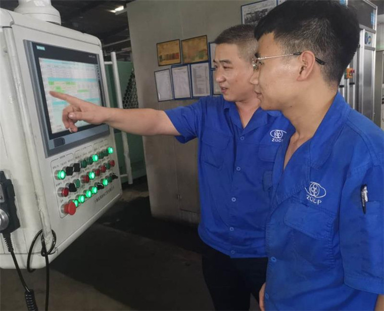 林超平(左)对员工进行现场技术指导