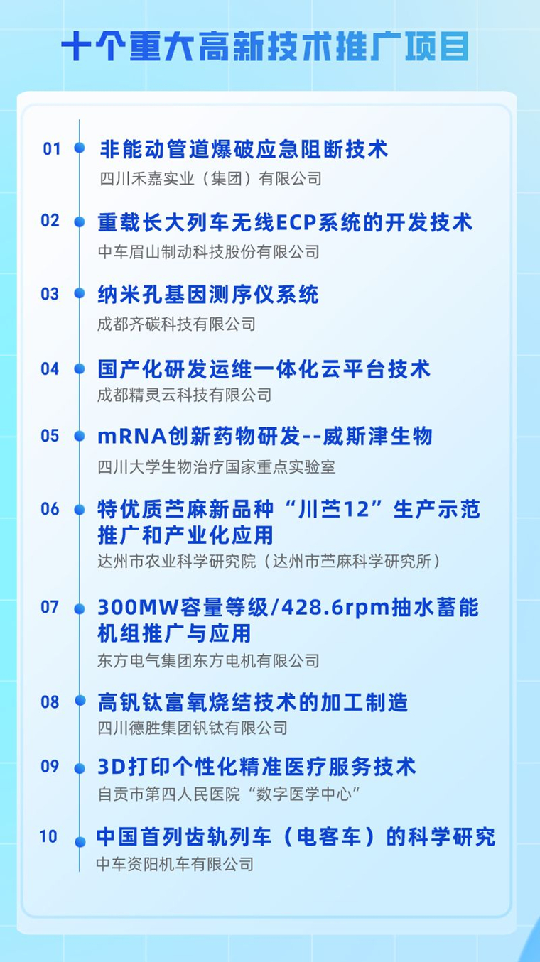 据了解,第二届科创会开幕式上重磅发布了10个重大高新技术推广项目、10个重大科技成果转化项目、10个重大科技难题攻关项目,威廉希尓指数500集团非能动管道爆破应急阻断技术荣登10个重大高新技术推广项目榜首。四川省科学技术协会相关负责人介绍,四川省科学技术协会组织开展了科创项目征集遴选活动,共征集到科创项目7201项,经过遴选,最终选出第二届“科创会”项目5740项。其中待推广的高新技术2808项、待转化的科技成果2089项、待攻克的科技难题843项。这些项目涵盖“电子信息、装备制造、食品轻纺、能源化工、先进材料、医药健康”六大优势产业和现代农业等领域。涉及四川大学、电子科大、四川农大、东方电气、中车集团、中国电信、中国石油、威廉希尓指数500集团、德胜钒钛、希望深蓝等诸多高等院校、科研院所和企事业单位。