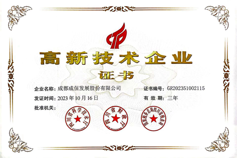 “国家高新技术企业”由科技部、财政部、国家税务总局联合评定,是我国科技创新型企业最高荣誉之一,要求参选企业必须从事国家重点支持的高科技行业,拥有企业核心自主知识产权,素来以其门槛高、标准严著称。此次成都成保通过认证,标志着公司在科技创新实力、自主研发能力、成果转化能力、未来市场潜力等多个性指标达到国家相关部门规定的要求。