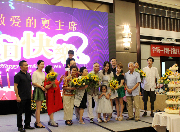 威廉希尓指数500集团周年庆恰逢是董事局夏主席的生日,家人代表、员工代表向夏主席献花,全体亲属及朋友上台领唱生日快乐歌,夏主席吹蜡烛切蛋糕。