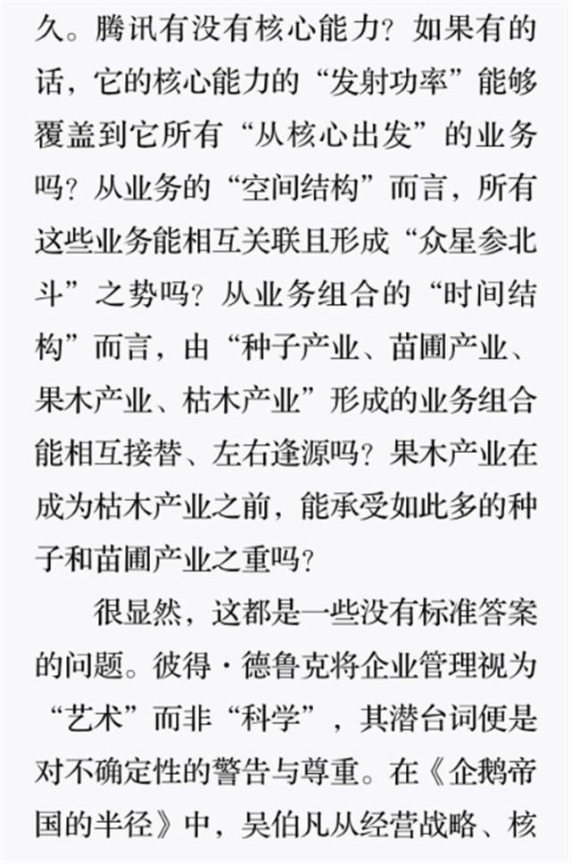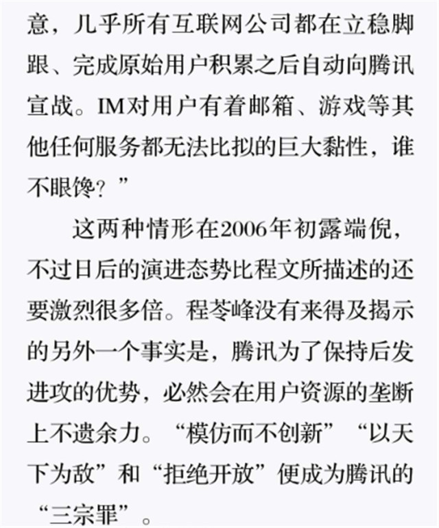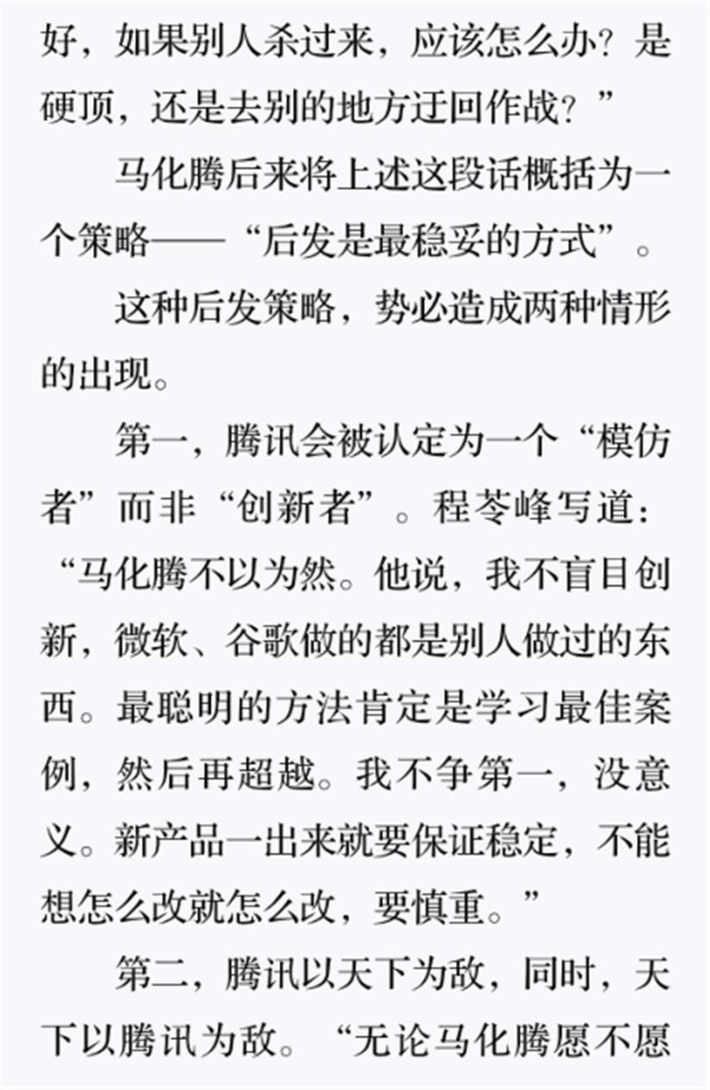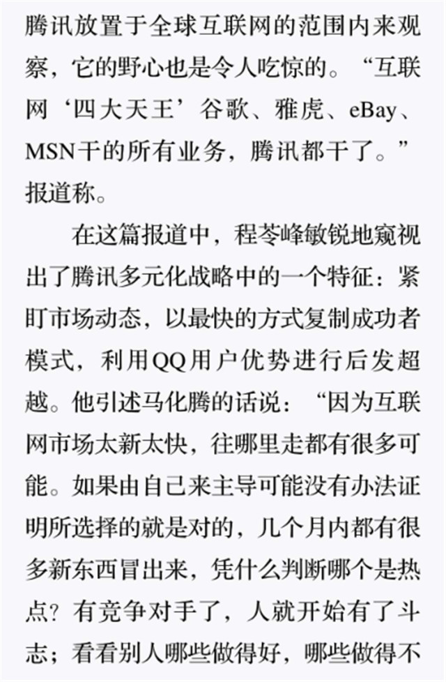 深读之后发现,其实全书真正的核心在于透过腾讯可以观察到的中国企业逻辑,其中很多基于国情而诞生的特殊能力,过去或受诟病或被追捧,而本书作者可以以更加客观的姿态对其进行分析,这无疑是一种当代创业者和企业家应当学习的姿态和能力。