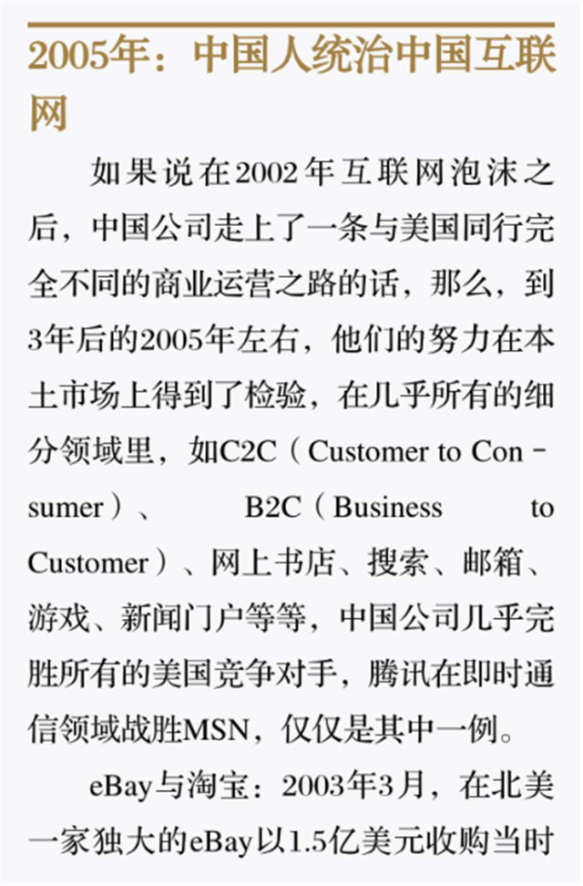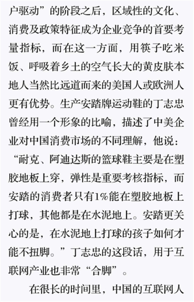 深读之后发现,其实全书真正的核心在于透过腾讯可以观察到的中国企业逻辑,其中很多基于国情而诞生的特殊能力,过去或受诟病或被追捧,而本书作者可以以更加客观的姿态对其进行分析,这无疑是一种当代创业者和企业家应当学习的姿态和能力。