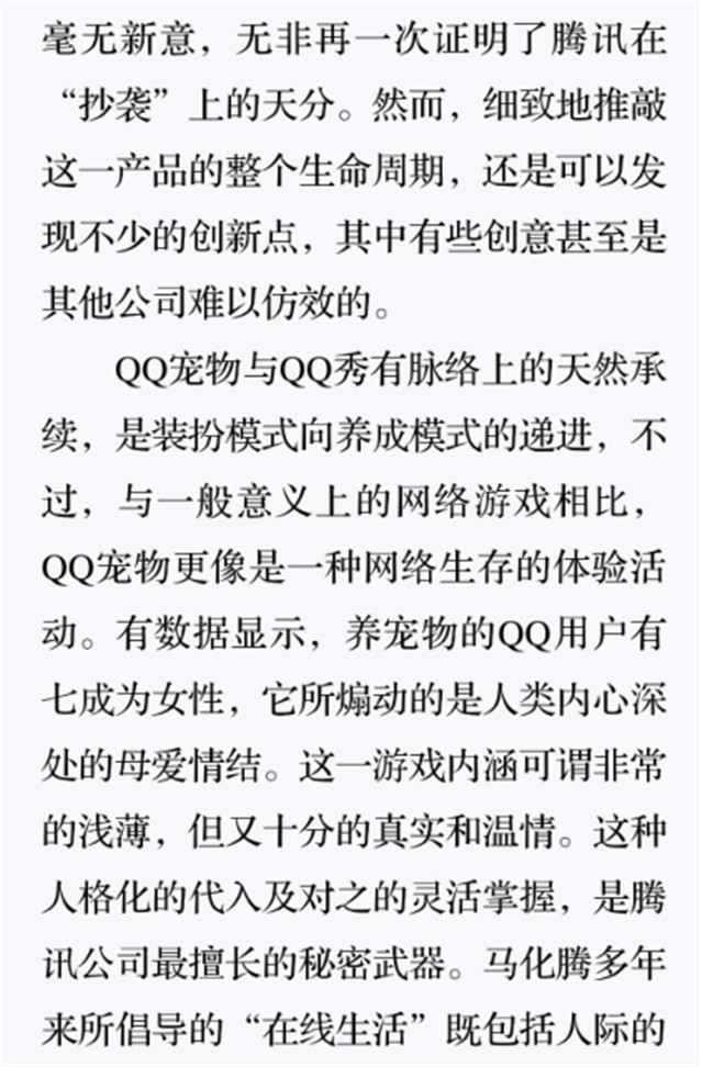 深读之后发现,其实全书真正的核心在于透过腾讯可以观察到的中国企业逻辑,其中很多基于国情而诞生的特殊能力,过去或受诟病或被追捧,而本书作者可以以更加客观的姿态对其进行分析,这无疑是一种当代创业者和企业家应当学习的姿态和能力。