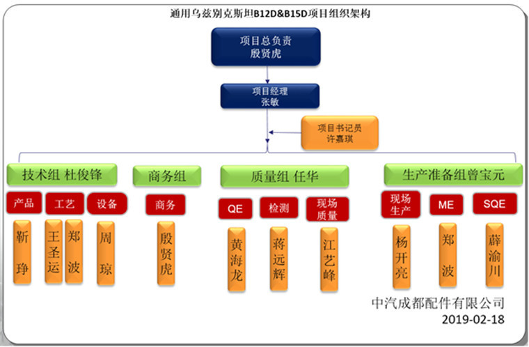 中汽成配公司早在2018年2月份的时候就已经向通用全球采购发出项目开发意愿,积极争取合作意向,接着通用全球采购组织审核我公司并发出询价,到2018年底通用全球中国SQE对我公司进行审核并批准B12D&B15D项目。2019年2月正式签订合同,3月份通用全球中国SQE对我公司项目进度进行审核,并与我公司每周一召开视频电话会议跟踪项目进度。目前双方合作进入正式技术商务交流阶段。