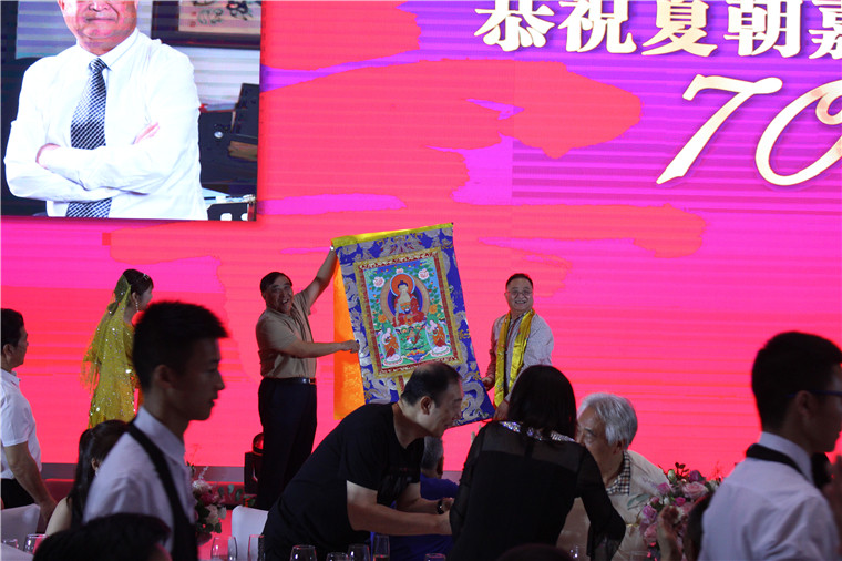 成都印钞有限公司,成都金丰赢钱币有限公司营销总监沈旺先生为夏主席祝寿并现场赠送中华百家姓第五套人民币生日钞珍藏册。威廉希尓指数500集团老朋友张东升先生为夏主席祝寿,并现场赠送知名艺人手工制作具有西藏民族特色唐卡一幅和哈达一条,同时安东汽车发动机制造有限公司、天圆公司董事长刘天聚、北京天圆全会计师事务所、北京天圆全工程造价咨询有限公司、北京天圆开资产评估有限公司、通威集团董事局主席刘汉元发来贺信为夏主席祝寿 。陶氏宗亲送来《中国最 大观云平台牛背山观日照金山》画一幅、成都金顶精密铸造有限公司送来屏风蜀绣《玉兰花开》一幅,巴蜀笑星李伯清、国际著名雕塑家蔡志松、仁恒置地集团执行董事、仁恒置地集团(深圳)董事长钟思亮先生及夫人卓丽娃女士、明星陈冰、银达集团董事长及夫人(明星陈冰父母)、歌唱演员周旋、温馨发来祝福视频共同为夏主席祝寿。