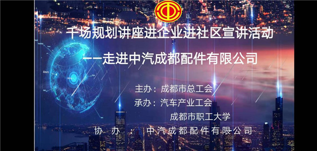 本网讯(李小清报道)按照市委市政府《关于庆祝中华人民共和国成立70周年活动的通知》(成委〔2019〕256号)要求,为了进一步提升广大职工群众对城市规划的认知度,激发全市职工奋斗新时代、逐梦新征程的昂扬斗志,2019年11月29日,由成都市总工会主办,汽车产业工会、成都市职工大学承办,中汽成都配件有限公司(以下简称中汽成配)协办的“千场规划讲座进企业进社区”宣讲活动在我公司二楼会议室举办。各部门工会成员及职工代表共三十多人共同聆听了此次讲座。该讲座由公司副总经理、工会主席邹祖力主持。
